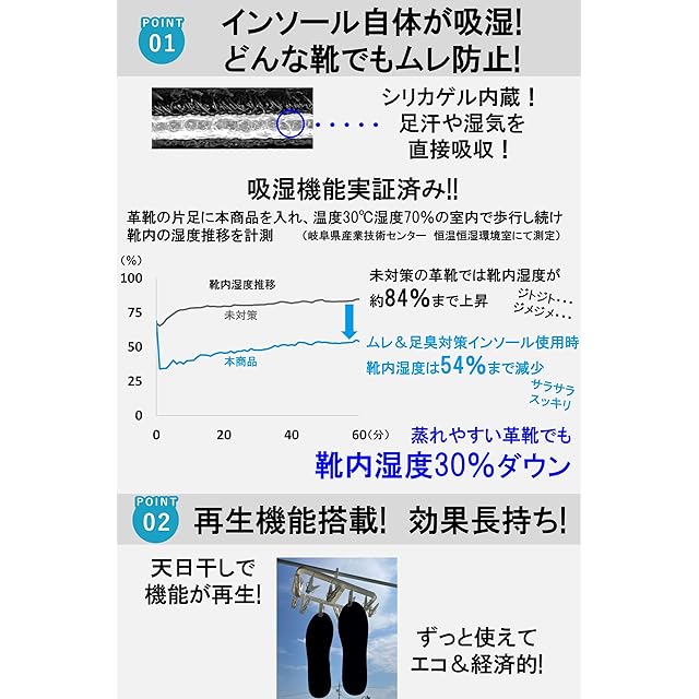 蒸れ防止機能:靴内湿度を未使用時に比べ30%以上ダウン。インソールに内蔵されたシリカゲルが足汗、湿気を吸湿します。