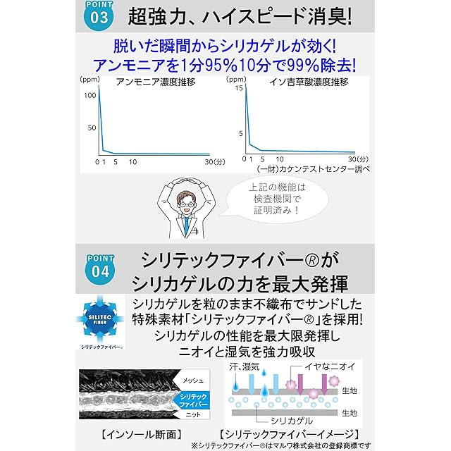 消臭機能:足臭の原因であるアンモニアを1分で95%、10分で99%消臭。イソ吉草酸も97%以上消臭。