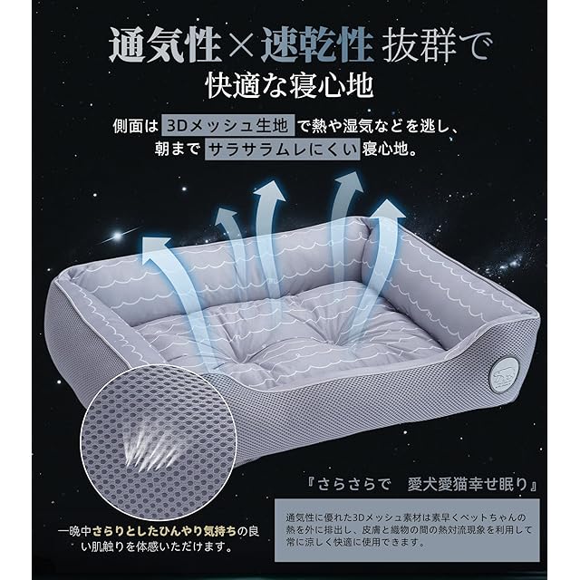 【1】接触冷感技術 ⇒ 鉱石冷感繊維QMAX0.53が、 触れた瞬間から表面温度を-3℃冷却 【2】3Dメッシュでムレにくい ⇒ 極薄メッシュが熱気を排出し、 被毛内湿度を45%以下に維持。 【3】帝人の抗菌防臭中綿 ⇒ 帝人の抗菌防臭中綿が、水洗い後も効果持続する「抗菌防臭」と「防ダニ」機能を実現 【4】PP綿30%増量×滑り止め 【5】インテリア融合 ⇒ 4色展開: ① グレー:シックなリビングに ② アクアブルー:海辺のリゾートテイスト ③ クールネイビー:上品な和室調和 ④ ブルー:ナチュラルルームの主役に ●Sサイズ(40×30×13cm) → チワワ・マルチーズなど超小型犬や子猫に最適 コンパクト設計でバルコニーの狭いスペースにも設置可能 ●Mサイズ(50×40×13cm) → トイプードル・シーズーなど小型犬~中型猫向け 洗濯後2時間乾燥の速乾性(湿度60%環境下) ●Lサイズ(60×50×13cm) → ダックスフンド・アメリカンショートヘアなど 老犬の介護用に低反発クッションを追加装備 ▼商品仕様▼ サイズ:S(40×30×13cm)/M(50×40×13cm)/L(60×50×13cm) カラー:グレー/ブルー/アクアブルー/ネイビー 素材:ポリエステル(接触冷感加工)/PP綿/滑り止めシリコン