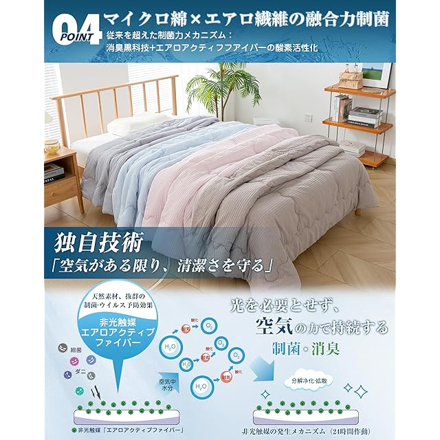 【マイクロ綿×エアロ繊維のW制菌】 湿気や汗でジメジメする夏は、菌が繁殖しやすい季節。マイクロ綿とエアロアクティブファイバーの酸素活性化の組み合わせで、空気がある限り、24時間持続的に制菌消臭作用を発揮する。低ホルムアルデヒドなのでお子様にも安心。洗濯しても抗菌防臭・防ダニ効果は持続する。