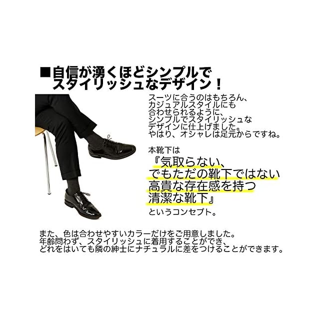 ■自信が湧くほどシンプルでスタイリッシュなデザイン!■スーツに合うのはもちろん、カジュアルスタイルにも合わせられるように、シンプルでスタイリッシュなデザインに仕上げました。やはり、オシャレは足元からですね。本靴下は『気取らない、でもただの靴下ではない高貴な存在感を持つ清潔な靴下』というコンセプト。また、色は合わせやすいカラーだけをご用意しました。年齢問わず、スタイリッシュに着用することができ、どれをはいても隣の紳士にナチュラルに差をつけることができます。