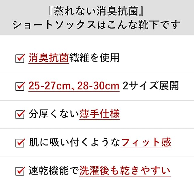 【蒸れない消臭抗菌フットカバーはこんな人にオススメです】分厚い靴下が苦手な方、靴を脱ぐことが多い方、学生・ビジネスマンの方。 【表糸と裏糸に消臭防臭繊維を採用】表糸に防臭加工糸を使用し裏糸にも消臭繊維のデオクリアーを使用することで徹底的に足の臭いを抑えます。デオクリアーは後加工品と違い、繊維そのものに消臭機能があるので洗濯しても消臭機能が持続します。しなやかな伸張回復性がある繊維は足をゆったりと包み込んでくれるのも特徴です。【柔らかさとフィット感を実現】コットンの自然な吸湿性が長時間の使用でも足を爽やかに保ちます。伸びにくく、ずれにくい、理想の履き心地を提供します。【乾きやすい素材】速乾性に優れた素材は綿よりも数倍乾きやすく急な雨に濡れた後や宿泊先で手洗いした後でもすぐに乾かすことができます。ペア探しの必要のない左右対称デザインは忙しいビジネスマンの貴重な朝の時間を無駄にしません。【安心安全・高品質の日本製】日本人の足にフィットするように試行錯誤を重ねたこだわりの靴下。日本人用に考えられた理想的な履き心地を体感ください