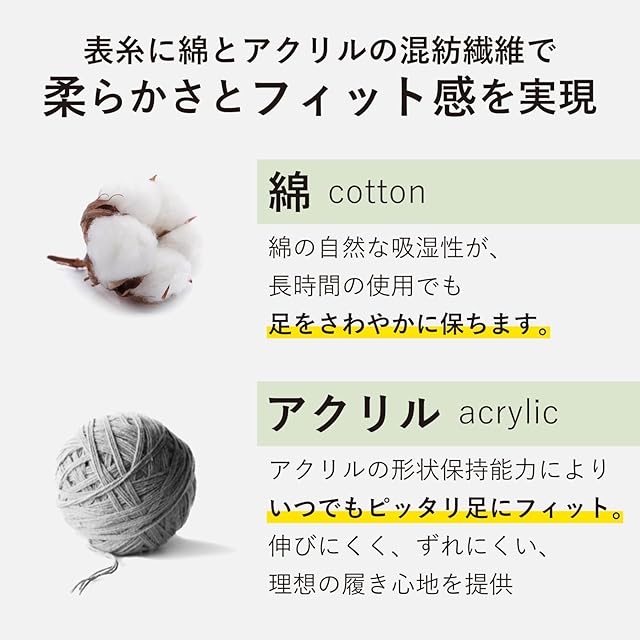 【柔らかさとフィット感を実現】表糸に綿を100%採用。コットンの自然な吸湿性が長時間の使用でも足を爽やかに保ちます。伸びにくく、ずれにくい、理想の履き心地を提供します。
