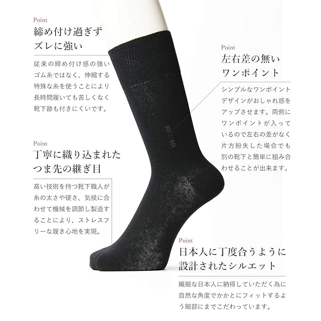 【他の靴下と見分けることが出来るワンポイント】洗濯後のペア探しが楽な左右対称デザイン&見分け可能なワンポイント付き!【スーツに最適な丈】 座っていても、脚を組んでも裾から肌を見えない理想的な丈を追求しました。日本人に合わせて設計されたサイズ感はズレやずり落ちを防止します。シンプルなブラックは結婚式やお葬式の喪服などにも使用いただけます