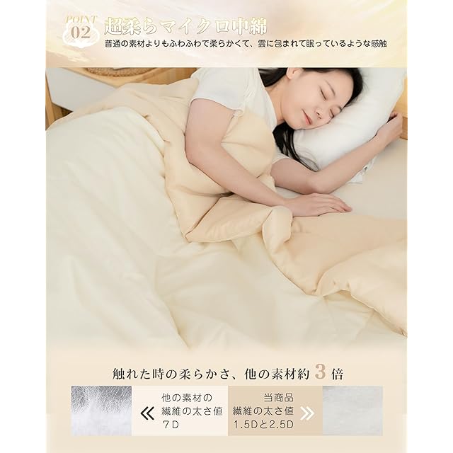 【5層構造・快適な温度が長~く続く!】①超柔ポリエステル生地+②超柔らか中綿+③TEIJIN高機能中綿+④VK Living独自の調温中綿+⑤ピーチスキン加工生地、2024年の新技術により、創造したこだわりの5層構造掛け布団です。春先から秋口まで長い期間使え、季節の変わり目には重宝します。