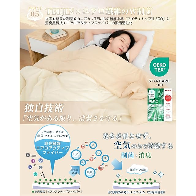 【TEIJIN×エアロ繊維のW制菌】 湿気や汗でジメジメする夏は、菌が繁殖しやすい季節です。中わたにテイジンの機能繊維「マイティトップII ECO」と、エアロアクティブファイバーの酸素活性化の組み合わせで、空気がある限り、24時間持続的に制菌消臭作用を発揮する。低ホルムアルデヒドなのでお子様にも安心。洗濯しても抗菌防臭・防ダニ効果は持続します。