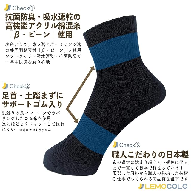 素材:綿・アクリル・ポリエステル・ポリウレタン(β・ビーン糸使用、抗菌防臭・吸水速乾加工)
