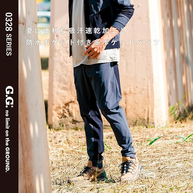 夏に便利な吸汗速乾加工と防水ポケット付き多ポケットパンツ