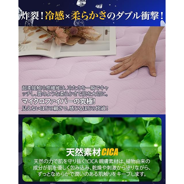 【極上冷感のタッチ】極冷感ひんやり敷きパッドは3D+7D中空綿入り中空锦職維の太さはデシテック (tex) で表します。数字が大きいほど、纖維が太くなリます。織維が太すぎるとバサバサになり、ふんわリ感がなくなります。逆に細す学るとペたリが生じやすいかさ高と通気性がなくなリます。試行錯誤の結果、3D中空締と7D中空締を一定の割合で混合して柔らかさと反発力を両立し、この軽くて暖かい布団が生まれました。