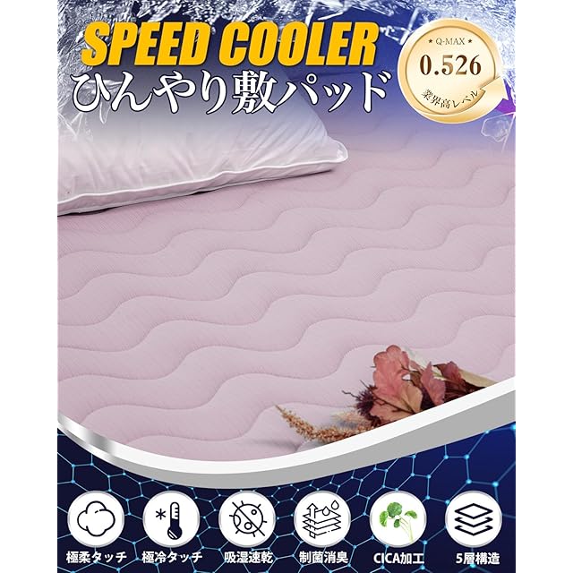 【極冷感ひんやり敷きパッド Q-MAX0.52】業界最高クラスを誇る接触冷感と吸汗機能をもつ冷感新素材を採用。第三者機関で実証済接触冷感評価値が「Q-MAX0.52」で、基準値の2.5倍もあり、冷感性の非常に高い数値で、触れた瞬間ひんやりと冷たく感じられます。一般の冷感 敷きパッドに比べ、ひんやり感がグレードアップ!また生地の織り方を変えることで吸水性を高めることができました。つい撫でたり頬ずりしたくなるツルツル柔らかい触り心地す。汗のにじむ夏の夜でも肌にまとわりつかず、朝までサラサラ快適に快眠できます。接触冷感の冷たさはお部屋の気温にも左右されますので、ひんやり感を高めたいなら、使用前に冷房等でお部屋を冷やしておくことをオススメします。
