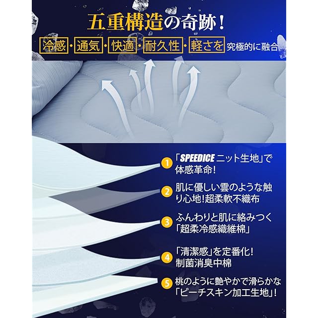 【極上冷感のタッチ】極冷感ひんやり敷きパッドは3D+7D中空綿入り中空锦職維の太さはデシテック (tex) で表します。数字が大きいほど、纖維が太くなリます。織維が太すぎるとバサバサになり、ふんわリ感がなくなります。逆に細す学るとペたリが生じやすいかさ高と通気性がなくなリます。試行錯誤の結果、3D中空締と7D中空締を一定の割合で混合して柔らかさと反発力を両立し、この軽くて暖かい布団が生まれました。