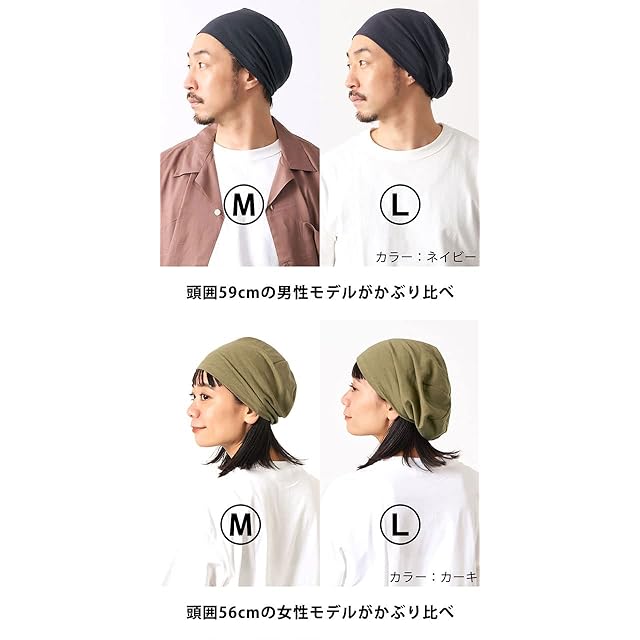 【選べる2サイズ展開】シーンに合わせてサイズが選べる薄手帽子。「Mサイズ」はぴったり、「Lサイズ」はゆったりとしたサイズ感。どちらも後頭部にはゴムが入っているのでジャストフィット。インナー帽子や洗髪できない時、ニオイが気になる時など性別・年代問わず使えます。