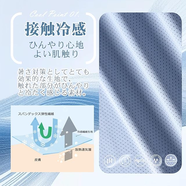 「涼感素材」KM 3.0(機能性涼感生地) 特殊涼感素材の使用により、人体などから発生する余分な水分に反応し、生地に隣接する周囲の熱を吸収。着ることによって涼しさを実感できる機能性アンダーウエアです。夏でも快適に過ごせます。