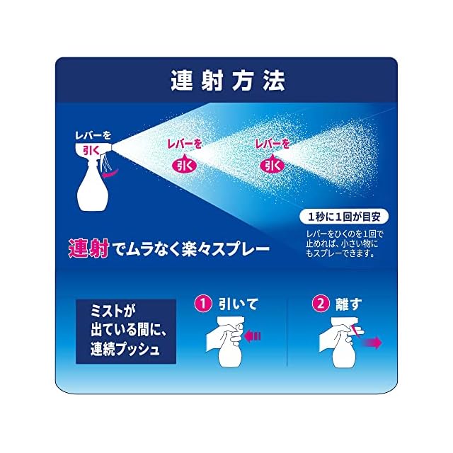 ワイドに広がるスプレーで大きいアイテムにも楽々スプレー可能。ベッドやカーペット、ソファへの使用がおすすめ。