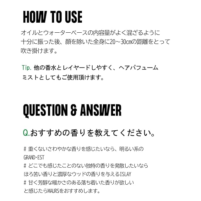 【NOLIEについて】 自分の周りを囲う偏見や固定概念を抜け出し、本当の自分が望むもの、必要とするものを探し集中できるように身体と心、生活までもを幸せにするセンシュアルウェルネスケアブランドです オレンジ:BRITTANY(ブリターニュ) スパイシーなペッパーとしっとりしたオークウッドの組み合わせで、大人で異国的な香り パープル:MAURS(モール) 落ち着いたネロリに甘いアンバーがレイヤードされ、柔らかくも強いギャップと魅力を表現できる香り レッド:ISLAY(アイラ) 爽やかなマグノリアフラワーとサンダルウッドの深みが、スモーキーでアロマティックウッディな香り イエロー:LOWLAND(ローランド) バニラ・ムスク・ジャスミンのほんのり甘いフレーバーフローラル漂うピュアパウダリーの香り グリーン:GRAND EST(グランテスト) ミュゲとパインウッドの透き通った爽やかな香り早朝の森を連想させる自然な香り