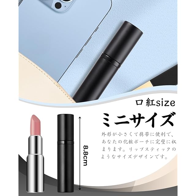 香水アトマイザーは、携帯性と使いやすさを重視した設計です。独自の底部充填システムにより、香水の補充が簡単で迅速。漏れ防止設計により、安心して持ち運びができます。高精度ナノミスト技術を採用し、細かいミストを均一に噴霧します。これにより、肌に優しく、香りを長時間楽しむことができます。 香水アトマイザーは、コンパクトなリップスティックサイズで設計されており、ポーチやバッグに簡単に収納できます。旅行や外出時に最適で、スペースを取らずに持ち運びが便利です。耐久性のある高品質な素材を使用しており、長期間の使用にも耐えられます。軽量で持ち運びが簡単なため、日常生活の様々なシーンで活躍します。 香水アトマイザーは、旅行、出張、デート、日常使用など、どんなシーンでも便利に使えるアイテムです。大切な人へのプレゼントにも最適です。持ち運びが簡単で、いつでもどこでもお気に入りの香りを楽しむことができます。