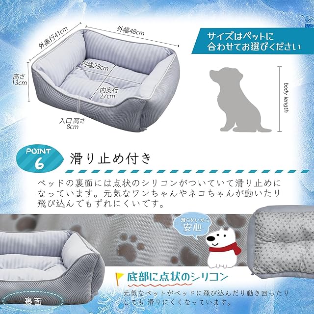 【優しいデザイン】クッション部分はひんやり柔らかく、ソファの端は少し固めるため、頭やあごが乗せやすく寝心地が良い。ベッド裏面に厚い滑り止め付きです。滑りやすいフローリングの上に置いいたときに、ペットがペッドに飛び込んでもすべらないので安心です。