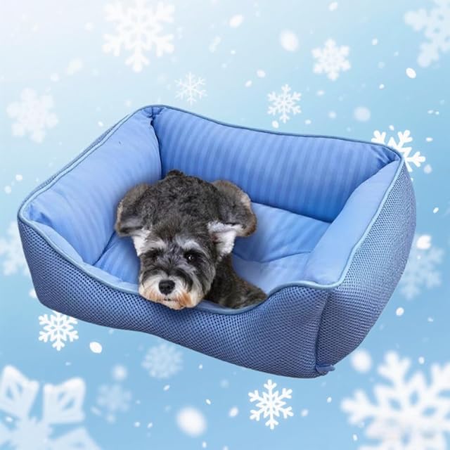 【熱中症や夏バデ対策に】犬や猫の熱中症及びクーラー病防止のため、ペットベッドの座面は夏の寝具と同じ品質の接触冷感生地(Q-MAX 0.5)を採用しました。肌が生地に触れた瞬間ひんやり。扇風機などと併用すると、冷感効果はだいぶアップになりますし、電気代の抑えにもなります。