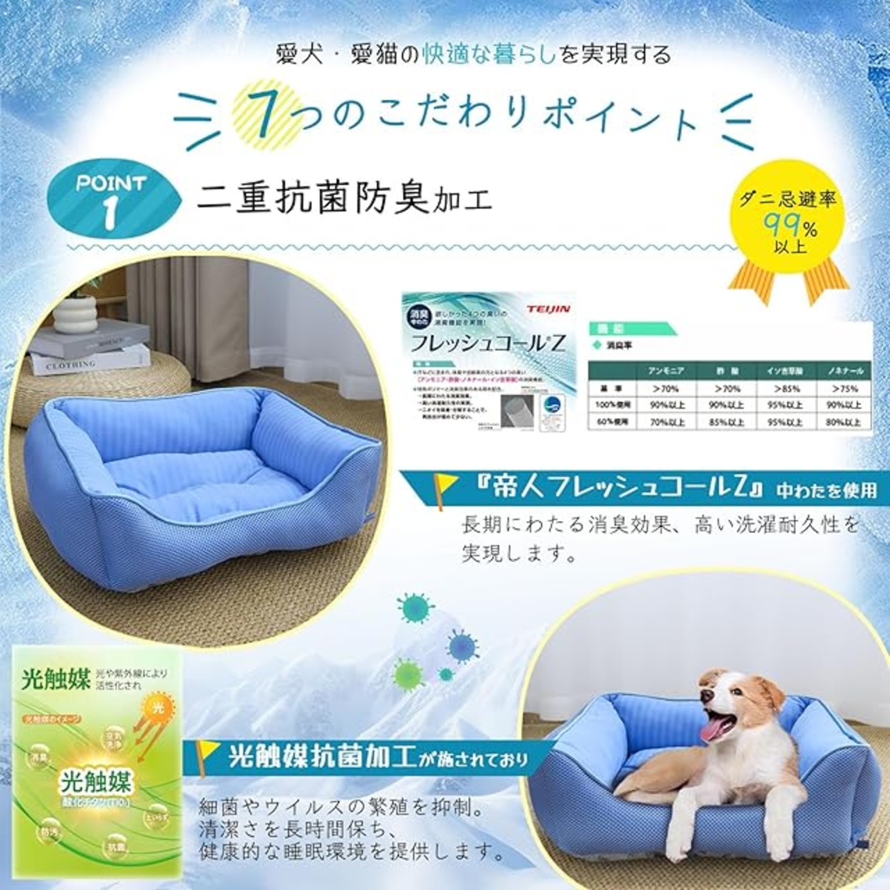 【帝人TEIJIN4大消臭+光触媒 2重抗菌4大消臭 】ペットベッド ペットクッション 夏 冷感 ひんやり 夏用 犬用ベッド 猫用ベッド ペット用品 洗える 暑さ対策 接触冷感 ふわふわ ペットソファー 滑り止め 毛が引っ付きにくい 枕付き 丸洗いOK 48*41*13cm ブルー