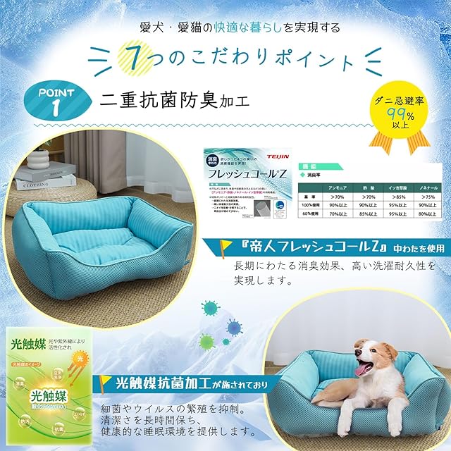 【帝人TEIJIN4大消臭+光触媒 2重抗菌4大消臭 】ペットベッド ペットクッション 夏 冷感 ひんやり 夏用 犬用ベッド 猫用ベッド ペット用品 洗える 暑さ対策 接触冷感 ふわふわ ペットソファー 滑り止め 毛が引っ付きにくい 枕付き 丸洗いOK 48*41*13cm レイクブルー