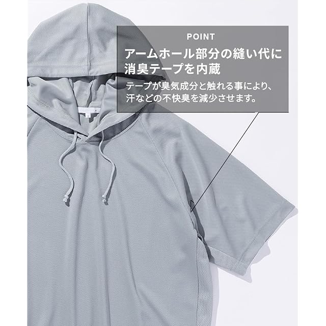 Tシャツ感覚でサッと着られる無地の半袖パーカー。本体生地はさらっとしたメッシュ素材、サイドは本体より目の粗いメッシュ素材の切替えを施し、お腹周りは立体設計で1サイズアップしなくてもスッキリ見えを実現!ラグラン袖で肩まわりが楽&消臭テープ付きだから汗っかきさんにもオススメ!大きいサイズも展開しております。(M/L/LL/3L/4L/5L/6L/8L/10Lサイズ)<br><br>【M】:(胸囲ヌード):88~96、胸囲:106、裄丈:45、着丈:67<br>【L】:(胸囲ヌード):94~102、胸囲:112、裄丈:47、着丈:69<br>【LL】:(胸囲ヌード):100~108、胸囲:118、裄丈:48、着丈:71<br>【3L】:(胸囲ヌード):106~114、胸囲:128、裄丈:50、着丈:73<br>【4L】:(胸囲ヌード):112~120、胸囲:134、裄丈:51、着丈:74<br>【5L】:(胸囲ヌード):118~126、胸囲:140、裄丈:53、着丈:75<br>【6L】:(胸囲ヌード):124~132、胸囲:146、裄丈:54、着丈:75<br>【8L】:(胸囲ヌード):136~144、胸囲:158、裄丈:56、着丈:77<br>【10L】:(胸囲ヌード):144~156、胸囲:170、裄丈:59、着丈:79
