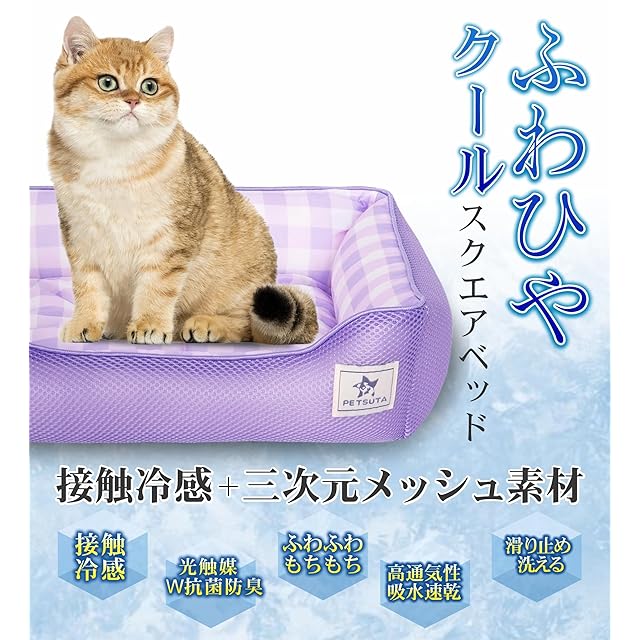 PETSUTA 犬 ベッド 夏【消臭+制菌】猫 ベッド 冷感 ペットベッド 犬 夏用ベッド ひんやり 暑さ対策 高通気性 猫用ベッド 犬用ベッド もちふわ ペットクッション 吸水速乾 洗える 滑り止め(パープル 50x40x15cm)