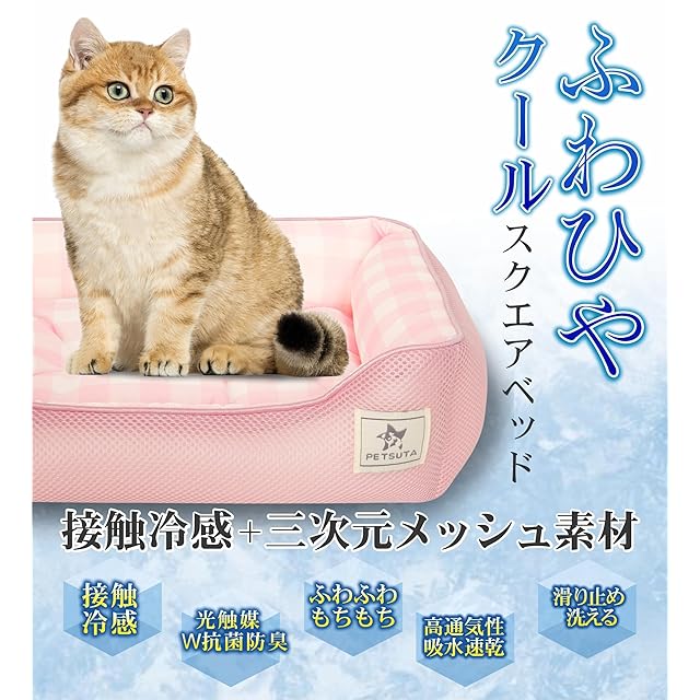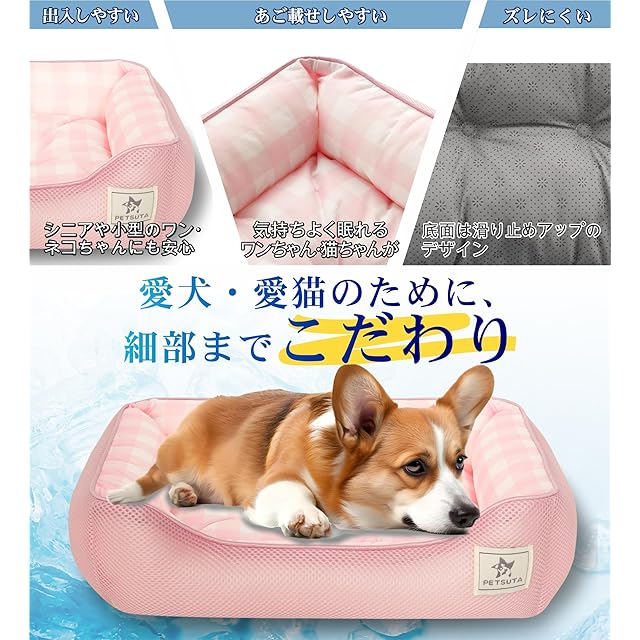 PETSUTA 犬 ベッド 夏【消臭+制菌】猫 ベッド 冷感 ペットベッド 犬 夏用ベッド ひんやり 暑さ対策 高通気性 猫用ベッド 犬用ベッド もちふわ ペットクッション 吸水速乾 洗える 滑り止め(ピンク 58x44x18cm)