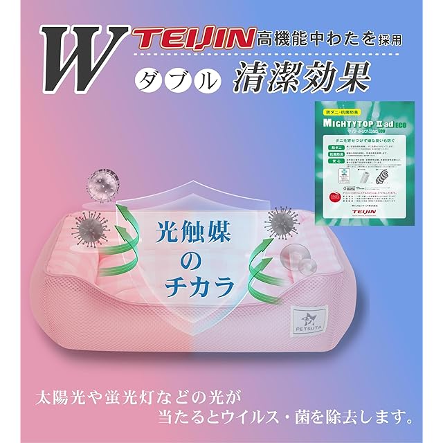 【ひんやり・光触媒抗菌防臭・防ダニ】愛犬や愛猫の熱中症及びクーラー病防止のために表地は接触冷感Q-max値0.45のひんやり生地です。また、ひんやり感だけでなく光触媒加工も施しており、萤光灯など微弱な室内光により長期間の持続抗菌防臭・防ダニ効果を発揮して清潔環境も整えました。蒸し暑い夏でも愛犬や愛猫が清潔で快適な環境で気持ちよくぐっすりと眠れます。
