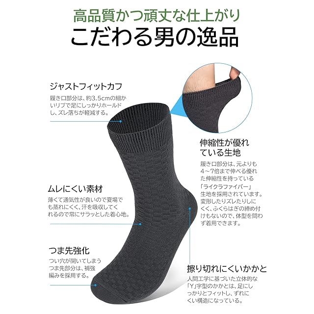◎ 素材:80%天然竹繊維、20%ライクラファイバー(優れた伸縮性を持っている弾性繊維である)。◎サイズ:M(23~25cm)、L(25~27cm)、XL(27~29cm)の3サイズから選択可能です。◎カラー:黒、紺色、ダークグレーの3色からお選べいただけます。◎ビジネスソックス5足セットです。