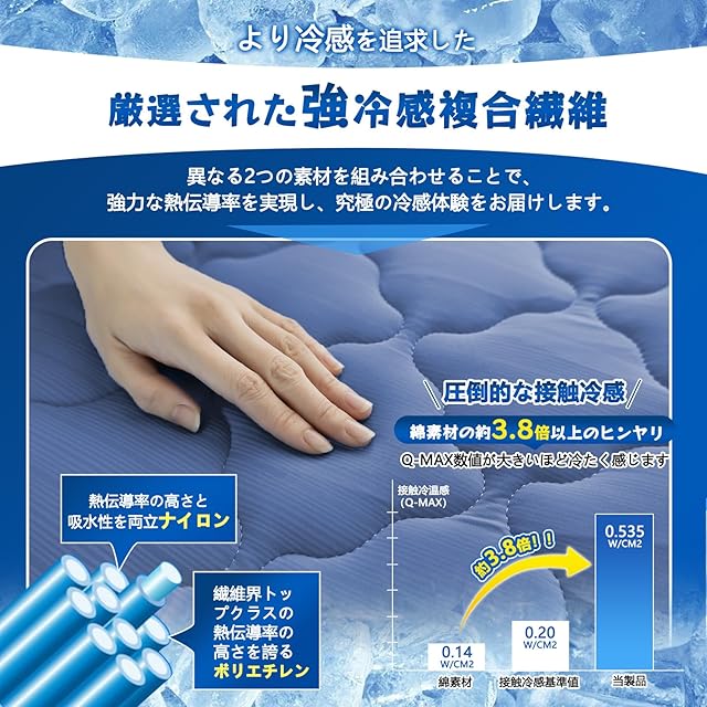 【厳選された冷感素材--究極の冷感体験を提供】冷感敷きパッドは、高品質なナイロンとポリウレタン混紡のニット生地を使用し、ポリウレタンを10%配合しています。科学的な組み合わせにより、生地の密度と快適性が大幅に向上し、冷感効果もさらに強化されました。Q-MAX値は0.535に達し、触れた瞬間に感じる快適なヒンヤリは、暑い夏でも比類ない冷感体験を提供します。