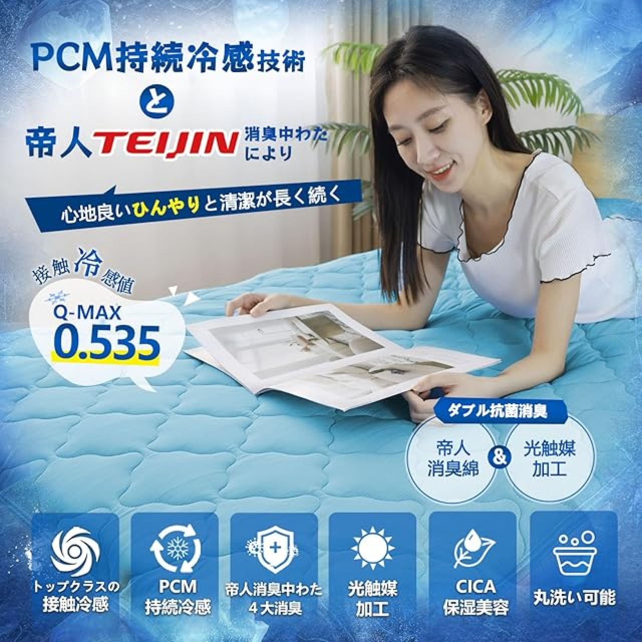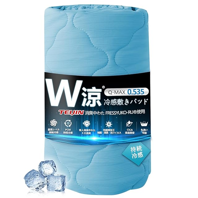 W涼・四大消臭】 冷感敷きパッド 夏用 Q-MAX0.535 帝人(TEIJIN)消臭繊維使用 PCM持続冷感 光触媒&CICA加工 抗菌・防臭 吸湿速乾 四隅ゴムバンド付き 丸洗い 快適な睡眠