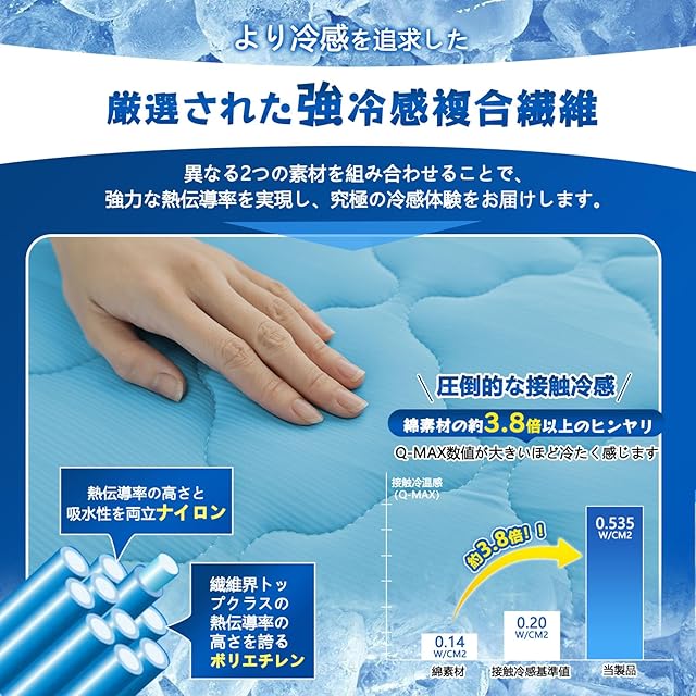 【厳選された冷感素材--究極の冷感体験を提供】冷感敷きパッドは、高品質なナイロンとポリウレタン混紡のニット生地を使用し、ポリウレタンを10%配合しています。科学的な組み合わせにより、生地の密度と快適性が大幅に向上し、冷感効果もさらに強化されました。Q-MAX値は0.535に達し、触れた瞬間に感じる快適なヒンヤリは、暑い夏でも比類ない冷感体験を提供します。