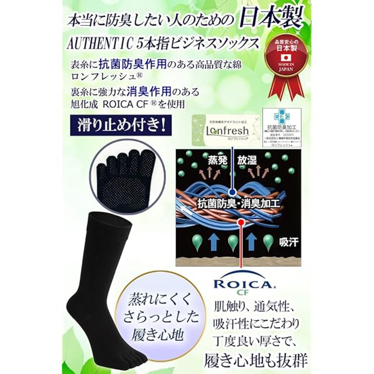 [オーセンティック] 【 5本指ソックス 】 日本製 20時間履いても臭くならない 「極 」 超 消臭 抗菌 防臭 吸汗 メンズ ビジネスソックス 滑り止め付 5足セット 25-27 cm 黒