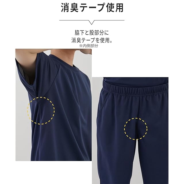 本体は汗を吸って乾きやすい吸汗速乾機能付きのメッシュ素材を使用しております。脇下・股部分に消臭テープを付けているので汗などのイヤな臭いを軽減してくれます。