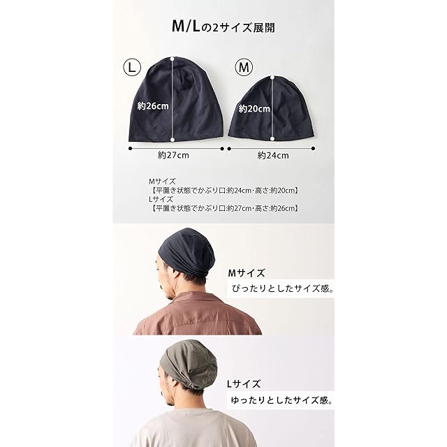 【選べる2サイズ展開】シーンに合わせてサイズが選べる薄手帽子。「Mサイズ」はぴったり、「Lサイズ」はゆったりとしたサイズ感。どちらも後頭部にはゴムが入っているのでジャストフィット。インナー帽子や洗髪できない時、ニオイが気になる時など性別・年代問わず使えます。