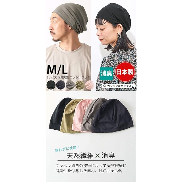 <b>【天然繊維×消臭機能を実現】</b><br></b> クラボウ独自の原料改質技術によって、天然繊維に「消臭機能」を付与した素材から生産された【NaTech生地】を使用した防臭ワッチ。コットン100%なのでお肌に優しく、汗臭や疲労臭・加齢臭の原因となる物質から放出されるニオイを95%以上消臭! <br><br><br><b> 【選べる2サイズ展開】</b><br></b> シーンに合わせてサイズが選べる薄手帽子。「Mサイズ」はぴったり、「Lサイズ」はゆったりとしたサイズ感。どちらも後頭部にはゴムが入っているのでジャストフィット。インナー帽子や洗髪できない時、ニオイが気になる時など性別・年代問わず使えます。 <br><br><br><b> 【高い洗濯耐久性】</b><br></b> 安心安全の"日本製"コットン帽子。薄手で通気性が良く蒸れずに快適。汚れても手洗いでの洗濯可能で、耐久性は抜群。洗濯耐久性試験では、洗濯を50回しても基準値をクリア!折り畳んでもかさばらないのでカバンに入れても邪魔にならず持ち運びにも便利。 <br><br><br><b> 【その他】</b><br></b> 素材から縫製まで帽子屋一筋20年以上携わっているバイヤーが生産管理しているので安心安全の商品をお届け。綿100%なのに消臭機能があるワッチは医療用帽子・ケア帽子としてもオススメ。春夏秋冬を通して、しっかりとしたフィット感でかぶれる帽子。 <br><br><br><b> 【仕様】</b><br></b> 【サイズ】Mサイズ(平置き状態でかぶり口:約24cm・高さ:約20cm) *後頭部のゴムでサイズ調整可能 【素材】コットン(綿)100% 【生産国】日本 【ブランド】CHARM 【対象】メンズ・レディース(男女兼用・ユニセックス) <br><br><br><b> 【注意点】</b><br></b> ・色落ちの恐れがありますので、単独で洗濯して下さい。<br> ・長時間濡れたままで重ねて置いたり、汗や雨などでぬれた時は他の衣料等に移染する場合がございますのでお気を付け下さい。<br> ・多少実際のカラーと異なる場合がございます。ご不安な事などございましたらお気軽にお問い合わせ下さい。<br>