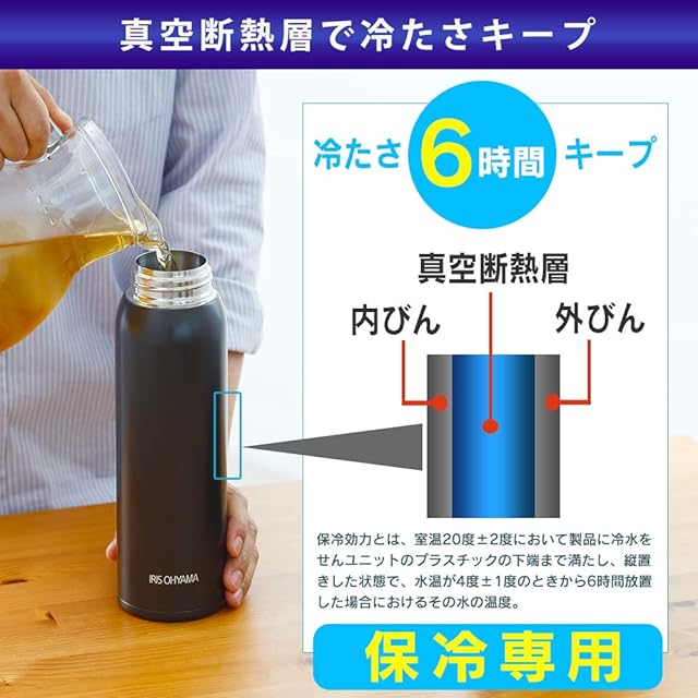 【真空断熱層で6時間冷たさキープ! 】外びんと内びんの間の真空断熱層が冷たさキープ。飲み物の冷たさを逃しにくく、外の熱を中に伝えにくい。だから保冷効果6時間持続! たっぷりの飲料も6時間冷たさをキープ。いつでも冷たい飲み物を楽しめます。