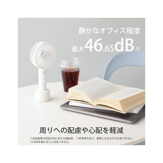 【注意事項】■付属品:専用充電スタンド、充電用USBケーブル、ハンドストラップ ■入力:DC5V 1600mA(USB充電式) ■充電電池:リチウムイオン蓄電池 ■USBコネクタ規格:USB Type-C ■コードレス対応(バッテリー交換不可) ■充電時間:約4時間 ※接続機器の電源供給能力によって極端に長くなる場合があります。 ■充放電可能回数:約300回 ■連続使用時間:約2時間~約9時間 ※使用する風量の強さによって異なります。 ■風量:5段階調節+リズム風 ■抗菌加工:無 ■ガードデザイン:スタンダードタイプ ■別売部品:有(専用回転スタンド、専用クリップ) ※過去モデルのフレハンディファンクリップにも対応しています。 ■取扱説明書:有 ■保証書:有 保証期間:6ヶ月 ■故障の原因になるため、必ず付属のケーブルをご使用ください。 ■原産国:中国 ※マーブル柄には個体差があります。