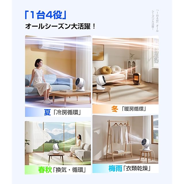 一年中使える空気循環扇! ・春・秋|換気をサポート 室内の空気を窓の外に排出し、新鮮な外気を効率的に取り込むことで、スムーズな換気を実現します。 ・真夏|部屋全体に冷気を行き渡らせる エアコンと一緒に使えば、床から天井まで冷気を循環させ、夏の冷房を最適化。エアコーの最強パートナーです。 ・冬|暖房効率をアップ 暖房機器と併用すると、温風を循環させて暖房効率を向上。省エネ効果も期待できます。 ・梅雨時期|洗濯物を素早く乾燥 上下左右オート首振り機能で、室内干しの洗濯物を短時間で乾燥。嫌なニオイや湿気の悩みから解放されます!