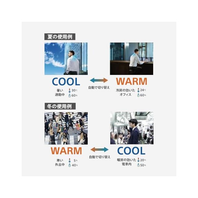 【目立たないサイズと静音性の両立】本体サイズはビジネスシーンでも目立たないサイズを実現。本体カラーは服装になじみやすいライトグレーを採用。動作音は従来比約50%低減(※6)。側面には新たに操作ボタンを搭載し、電源ON/OFF、COOL/WARMモードの切り替えとレベルの選択ができ、スマートフォンを使えない場面でも基本的な操作が可能。