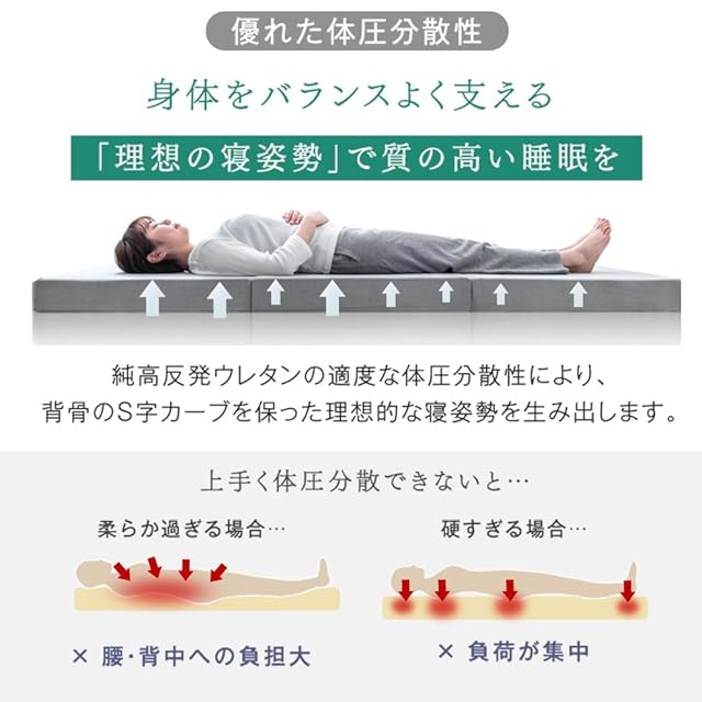 【スタッフのおすすめポイント!】・腰をやさしく支える高反発マットレス ・不純物を含まず、においを軽減させた純高反発 ・反発弾性までしっかり検査した高品質ウレタン ・シックハウス症候群の原因物質7種を検査で安心 ・カバーは世界基準の安全性 エコテックス認証生地 ・床敷きでも使えるしっかり厚み10cm ・収納やお手入れに便利な3つ折りタイプ ・ISO9001認可工場での生産 ・着脱しやすいU字ファスナー