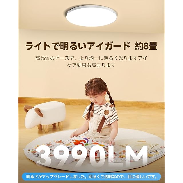 【省エネ・高輝度・薄型デザイン】○高効率LEDレンズを使用し、32Wの低消費電力で3800lmの高輝度を実現しています(蛍光灯の2倍の明るさで電気代は半分)。6-8畳の部屋を隅々まで明るく照らします。○厚さわずか3.3cmの極薄デザインとサイドライトの組み合わせにより、スペースを取らずに家庭的でロマンティックな雰囲気を演出します。