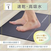 【高い吸水力】表面のナノファイバーと珪藻土が持つ独特の細かな孔構造により水分を素早く吸収し足元をすぐに乾燥させます。 ※一定の水分量を超過しますと吸水や乾燥に通常より時間がかかる場合があります。ご使用の際は水気を軽く落としてからの使用をお勧めしております。