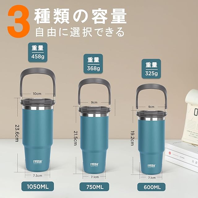 TYESO タンブラー ストロー付き 600ml コーヒー 水筒 魔法瓶 保温保冷 取っ手付ケトル 真空断熱 二重構造 広口 大容量 直飲み 漏れない ホームオフィス アウトドア 女の子 男の子 ネイビー