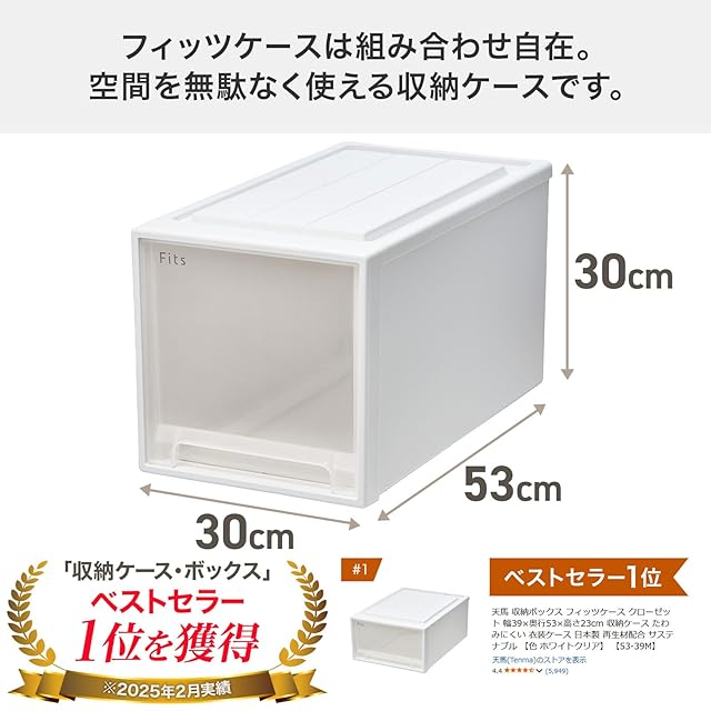 天馬 収納ボックス フィッツケース クローゼット 幅30×奥行53×高さ30cm 収納ケース たわみにくい 衣装ケース 日本製 再生材配合 サステナブル 【色 ホワイトクリア】 【53-30L】