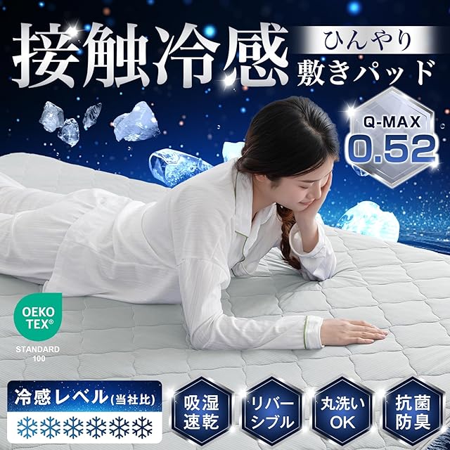 【ひんやり冷感敷きパッド】熱伝導率の高い素材を使った接触冷感敷きパッド。Q-MAX0.52以上ので、触れるとひんやり涼しく感じます。寝返りのたびにひやっとして気持ちよく、肌の熱を吸収してくれるので、暑い夜も快適にお使いいただけます。より涼しく心地良いやさしい肌触りで速乾性にも優れています。