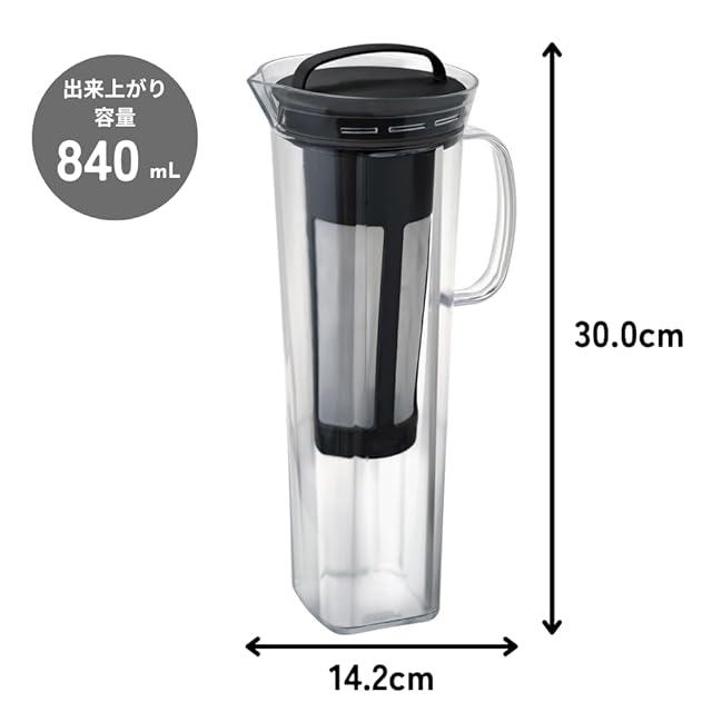 【商品詳細】本体サイズ:幅14.2×奥行10.8×高さ30.0cm、本体重量:約370g、出来上がり容量840mL、本体材質:本体/PCT樹脂(日本製)、フタ・ストレーナーフレーム/ポリプロピレン(日本製)、フタパッキン/シリコーンゴム(ベトナム製)、メッシュ/ポリエステル(日本製)