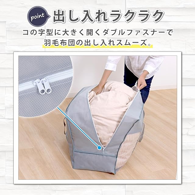【持ち手で簡単に持ち運び】:ダブルスライダーでコの字にガバッと開くので羽毛布団の出し入れがスムーズ。