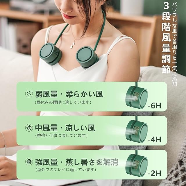 【軽量設計】首掛け扇風機本体の重さが僅か180g軽量で、市販品のより約100gを軽減して、長時間使ってもそんなに負担にならない、快適に利用できます。Phone 14 Pro(206g)より軽くて、カバンに収納して出かけても負担になりません。