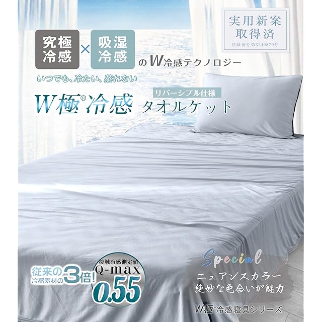 【業界最高Q-MAX値0.55 タオルケット 夏用】業界初!更なる冷たさと寝心地を求めて試行錯誤を繰り返し、ついに「究極冷感」×「吸湿放熱冷感」2種類の極冷感糸100%を独自技術でオリジナル二層構造にすることによって、業界トップクラスを誇る本物のQ-MAX値0.55を実現!さらに抜群な吸放湿性と通気性を併せ持つ(W極冷感寝具シリーズ)夏用の冷感タオルケットです。接触冷感性が群を抜いて高いポリエチレン繊維を肌に接触する側に、さらに汗をかいてもサッと吸い取ってくれる高吸放湿ナイロン繊維を裏側に配置した当社独自の2重織冷感表生地(実用新案取得済)は、従来の単一素材の冷感生地はもちろん、同じポリエチレンとナイロンを使用した混紡/複合生地とも大きく違い、繊維の使用量は2種類とも100%にしたことで、冷たさだけではなく、湿気やムレなどを極力抑え、吸放湿効果や通気効果も「最大限まで」発揮できます!寝返りするたびひんやり感がより速く回復するため、接触冷感よりも持続冷感を実現!朝まで究極なヒンヤリ感×サラサラで最高の寝心地をキープ!暑がりの方や極力冷房を使いたくない方に是非おすすめ。